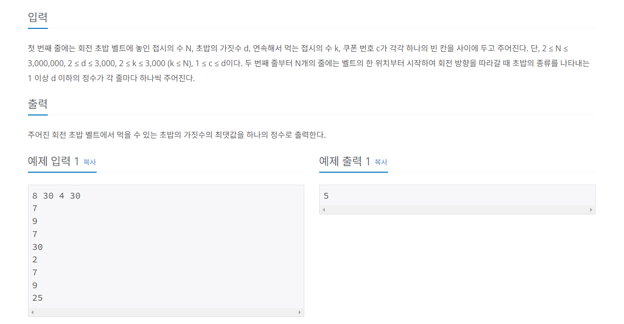 첫 번째 줄에는 회전 초밥 벨트에 놓인 접시의 수 N, 초밥의 가짓수 d, 연속해서 먹는 접시의 수 k, 쿠폰 번호 c가 각각 하나의 빈 칸을 사이에 두고 주어진다. 단, 2 ≤ N ≤ 3,000,000, 2 ≤ d ≤ 3,000, 2