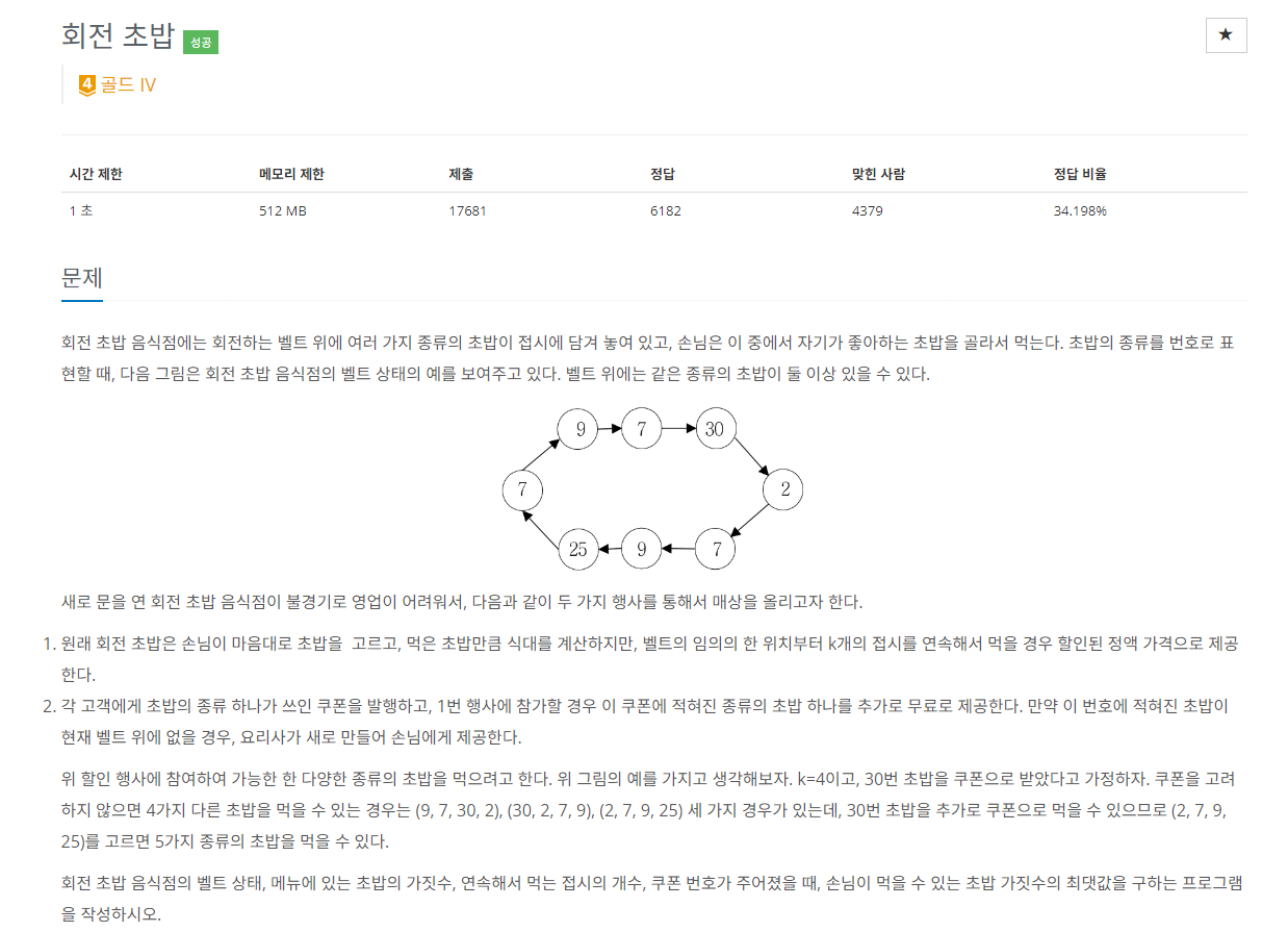 1. 처음 설계했을 땐 "회전"(배열의 시작과 끝이 이어져있음)의 특성을 고려하지 않아서 제출 후 10퍼센트 정도에서 틀렸다는 문구가 출력됐었다. 슬라이딩 윈도우 알고리즘을 사용해서 Sysout으로 한 문장씩 아무리 찍어봐도 왜 틀린건지 알 수가 없었는데, 생각해보니 N번만 돌릴게 아니라 N + k - 1까지 돌려서 확인해야했다.
