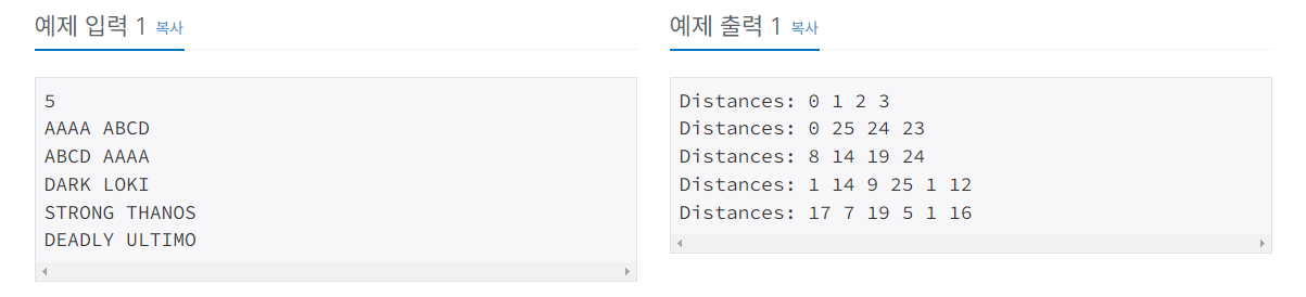 첫째 줄에 테스트 케이스의 수 (< 100)가 주어진다. 각 테스트 케이스는 한 줄로 이루어져 있고, 두 단어가 공백으로 구분되어져 있다. 단어의 길이는 4보다 크거나 같고, 20보다 작거나 같으며, 알